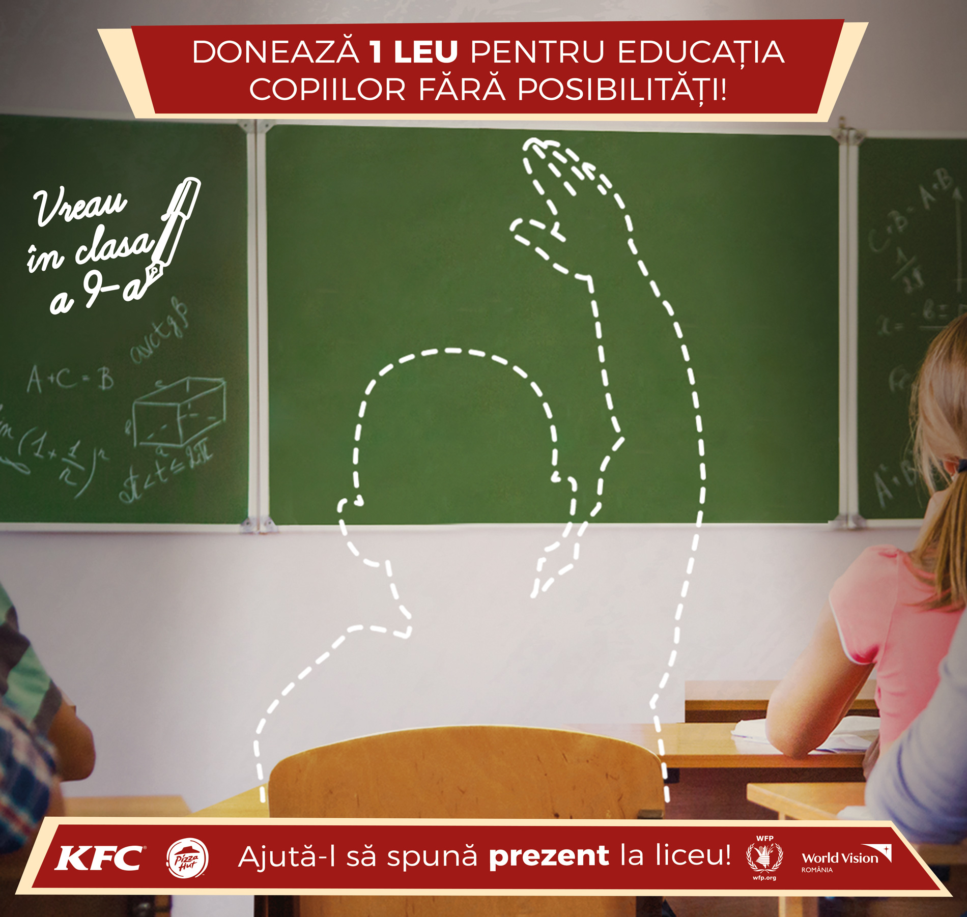 Proiectul „Vreau în clasa a noua” a devenit deja o tradiție în restaurantele KFC și Pizza Hut. În toată luna octombrie se pot face donații pentru copiii înscriși în programul World Vision, în urnele special amenajate în locații.