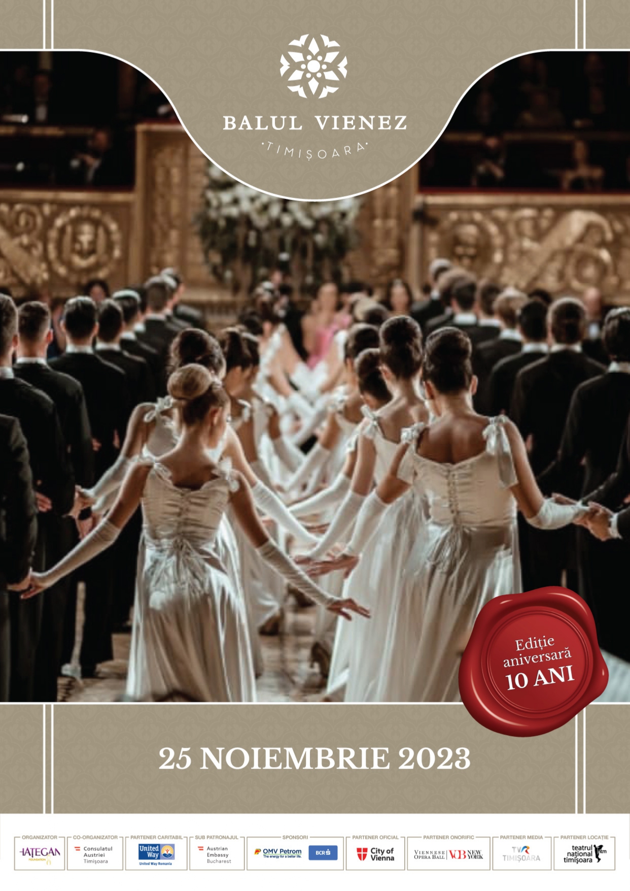 Balul Vienez Timișoara 2023, un deceniu de eleganță și caritate, în Capitală Europeană a Culturii anunță deschiderea înscrierilor pentru a participa la cea de-a X-a ediție care va avea loc sâmbătă, 25 noiembrie 2023, începând cu ora 19:00, la Teatrul Național Timișoara.