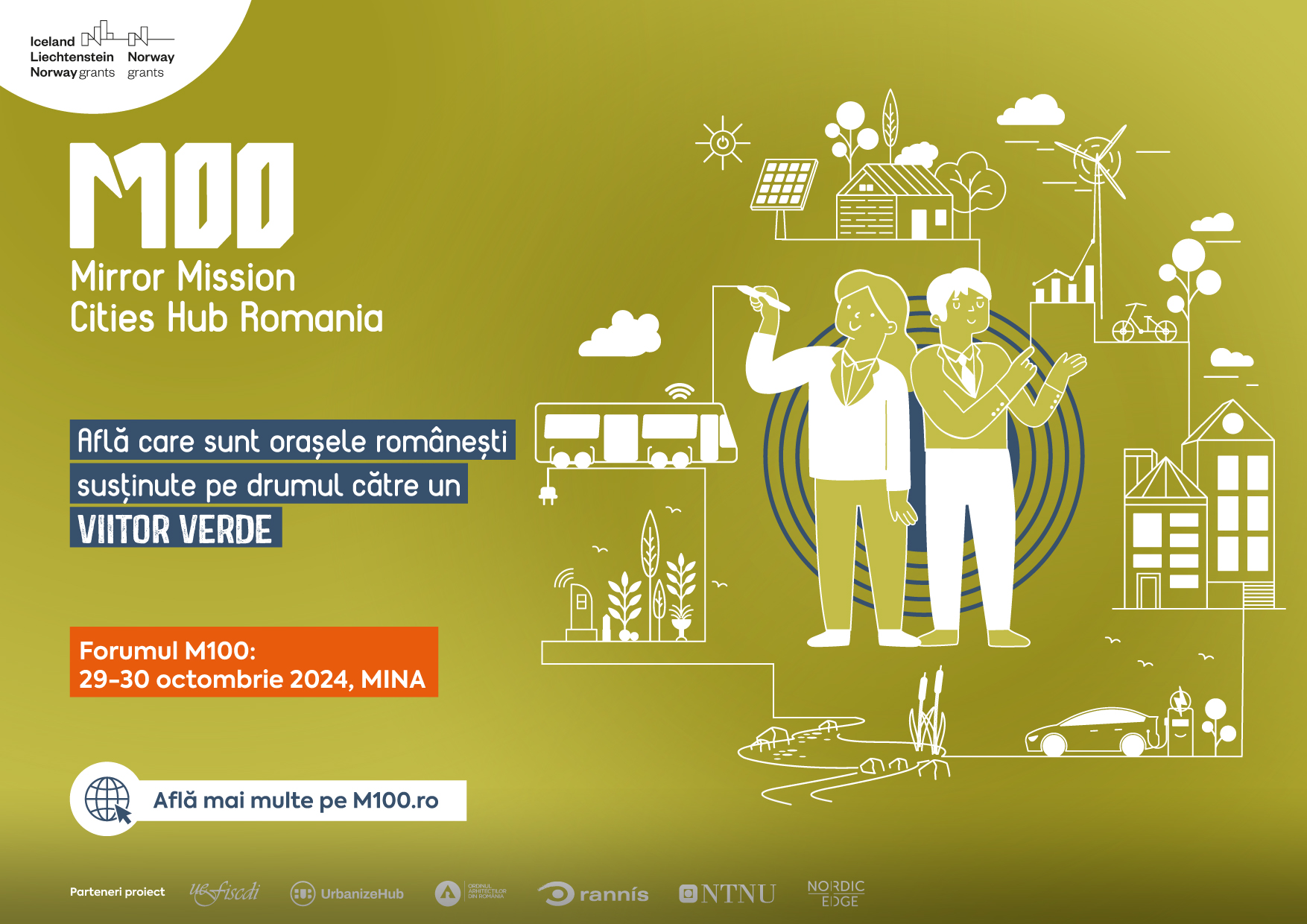 Forumul pentru Neutralitate Climatică M100 este organizat sub egida Hub-ului Național M100, coordonat la nivel interministerial, și face parte din proiectul “Towards Climate-Neutral and Smart Cities through Mutual Learning, Engagement and Capacity-Building,” finanțat prin Granturile SEE și Norvegiene în cadrul Fondului pentru Relații Bilaterale, și implementat sub egida HUB-ului M100, prin UEFISCDI în calitate de operator de programe în parteneriat cu Urbanize Hub – Asociația Institutul pentru Dezvoltare Locală, Ordinul Arhitecților din România (OAR), Norwegian University of Science and Technology(NTNU), Nordic Edge și RANNIS – Icelandic Center of Research.