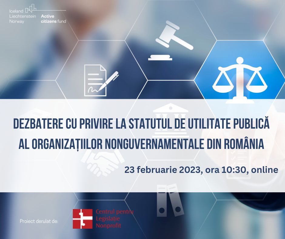 Centrul pentru Legislație Nonprofit organizează pe 23 februarie a.c., o dezbatere cu privire la statutul de utilitate publică al organizațiilor nonguvernamentale din România.