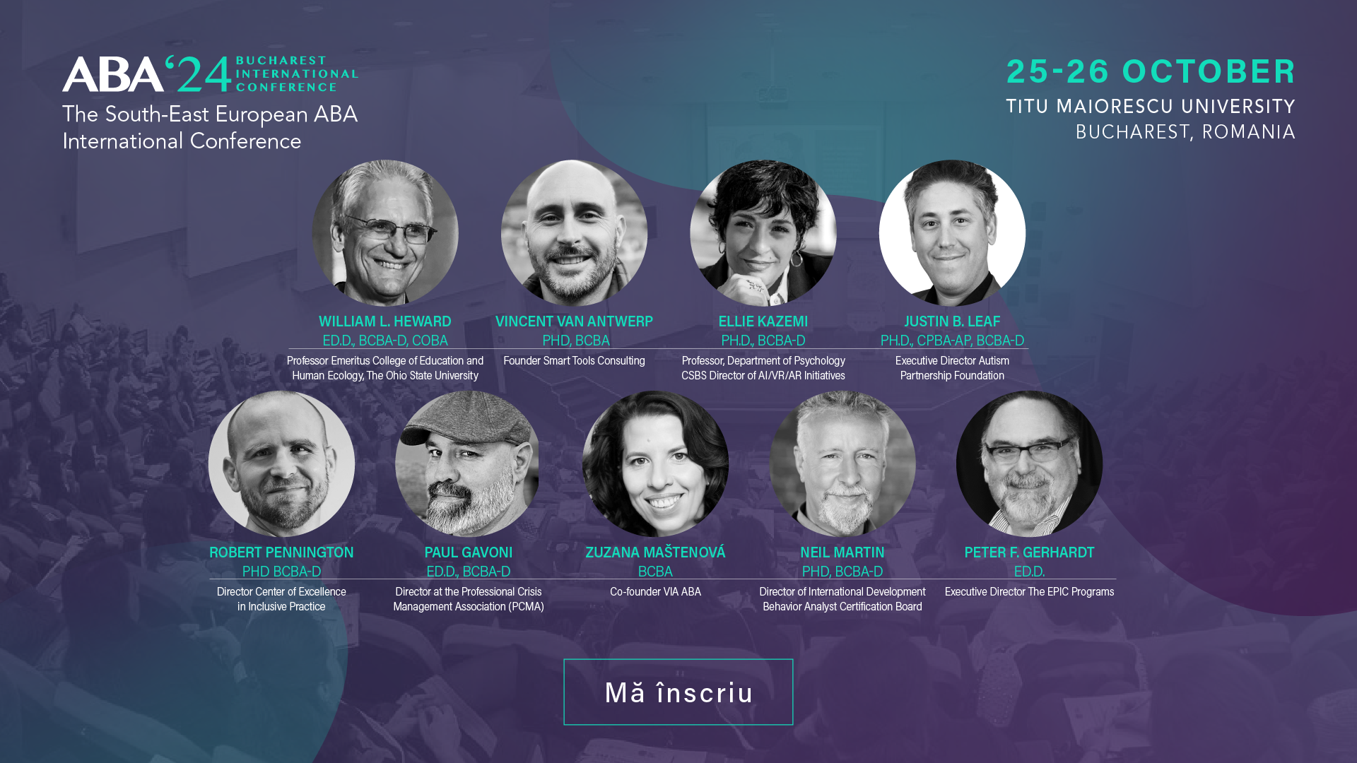 Conferința Internațională ABA 2024 aduce laolaltă cele mai strălucite minți din domeniu, pentru a discuta cele mai recente descoperiri și a explora noi modalități de a sprijini persoanele cu autism. Cu sesiuni susținute de experți internaționali precum Ellie Kazemi, William Heward și Dr. Paul Gavoni, conferința va acoperi teme variate, de la gestionarea crizelor comportamentale și aplicarea ABA în școli și comunități, până la creșterea performanțelor echipei de terapie.