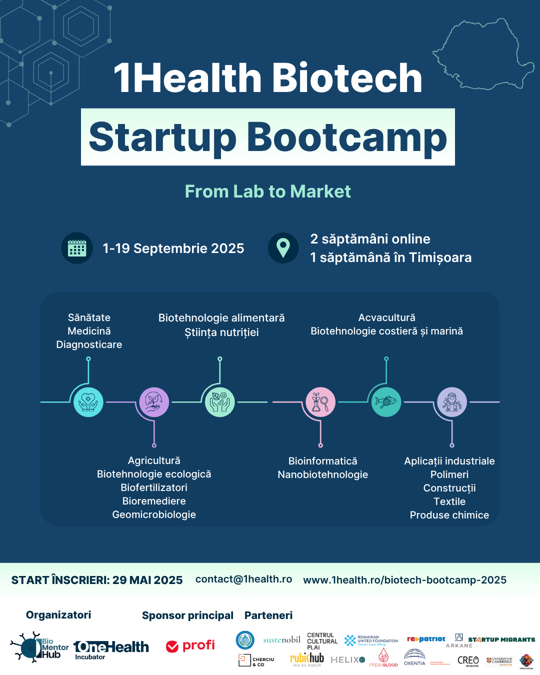 De curând, asociația BioMentorHub și 1Health Incubator au lansat 1Health BioTech Start-up Bootcamp, un program de studiu dedicat cercetătorilor din științele vieții. Aceștia selecționează 10 start-up-uri care în această vară pot scoate ideile din laborator în piață. Timp de 3 săptămâni, participanții selecționați vor beneficia de 2 săptămâni online și 1 offline în Timișoara, unde vor învăța de la experți și mentori, inclusiv cercetători români din diaspora, cum să-și șlefuiască rezultatele cercetării în produse și business-uri viabile.